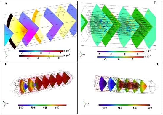 With regards to heat transfer, the results of the simulation can be observed in Figure 8, which is divided into four parts. The first two parts (A and B) show the surface plots of the axial and radial total heat flux (W/m2) in the foam (A) and monolith (B) systems; the second parts show the surface plots of the temperature distribution in the foam (C) and monolith (D) systems. In Figure 8A,B, the top scales report the radial total heat flux values, while the bottom scales show the axial total heat flux values. In particular, in the case of the foam (Figure 8A), as it was not possible to discriminate between the solid and gas phase (the simulation of the foam is obtained by applying mathematical equations, so that the domain was not obtained by the drawing of the real patterns of the struts), the trend inside the entire domain was evaluated. It was observed that there was a negative axial flux in the first zone of the foam, and a positive axial flux in the second zone. Furthermore, the radial flux was positive in the first zone of the foam, and it became lower approaching the end of the structured catalyst.
