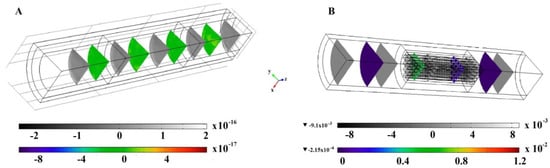 Here, the above scales refer to the radial mass flux, while the scales below refer to the axial mass flux. In particular, it can be observed that for PtCeWF10 (Figure 10A), both the axial and the radial components of the mass flux are almost equal to zero, all along the catalytic bed, showing a complete homogeneity of the system, again caused by the tortuosity of the flow field generated inside the foam. Different behavior can be observed in the case of PtCeWM (Figure 10B), in which the radial component is equal to zero, while the axial component shows a clear gradient, starting from values of about 0.6 × 10−2 mol/m2/s up to zero.