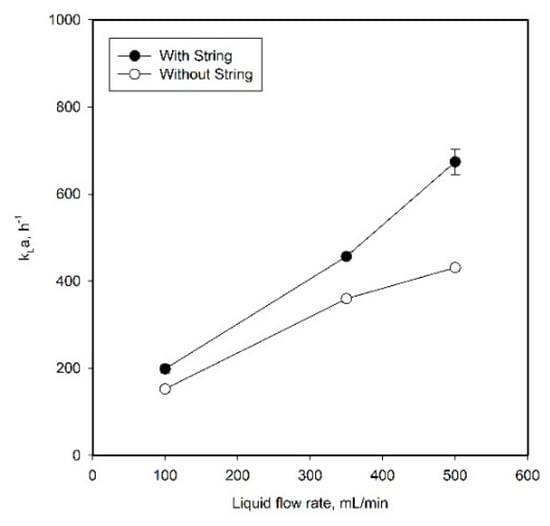 To investigate the effect of varying the liquid flow direction on the mass transfer efficiency, the mass transfer coefficients for oxygen were measured at various liquid flow rates with and without the string in the system. As shown in Figure 2, the mass transfer performance of the SFR was considerably influenced by the liquid flow rate. It was observed that kLa values increased by 3.39 times and 2.83 times with and without the string, respectively, when the liquid flow rate increased from 100 mL/min to 500 mL/min.