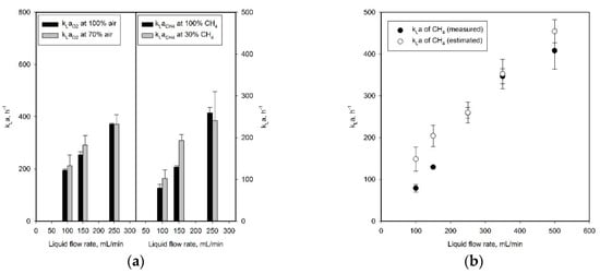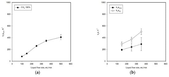The mass transfer coefficients obtained for methane were measured at various liquid flow rates. As in the experiments with air, the mass transfer coefficients increased with the liquid flow rates (Figure 3a), but the extent of this increase was reduced with the liquid flow rates, while the variances of the kLa values under the same conditions increased. The mass transfer coefficient of methane at the liquid flow rate of 100 mL/min was 79.0 h−1 and increased to 408.0 h−1 at a liquid flow rate of 500 mL/min.