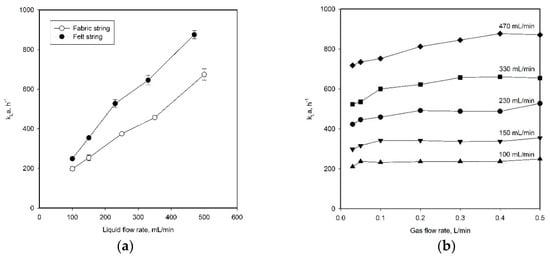 The hydrophilic property of the string material is in accordance with the hydrophilic behavior of the material that was observed in this experiment. The felt material was able to be perfectly wetted by the water and could maintain sufficient contact with water without forming droplets on its surfaces. However, for the case involving fabric strings, the liquid flow was not stable and the droplets were splashed on the wall surface of the system; this tendency became more severe with the increase of the liquid flow rate. The mass transfer performance of the SFR was affected by the hydrophilicity of the string material, as shown in Figure 4a. The felt material, which is more hydrophilic, achieved kLa values that were about 1.3 times higher than those of the fabric material.