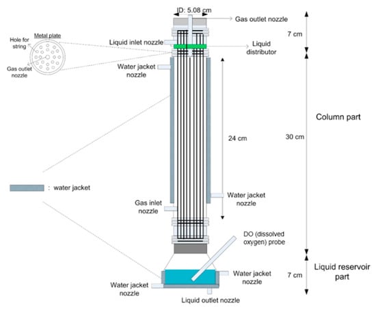 The SFR had two main parts, i.e., a column part and a liquid reservoir part. The column part, where the contact between liquid and gas took place, had a total volume of 486 mL with a void fraction of 0.92, and consisted of 20 strings with a diameter of 0.3175 cm and an effective length of 24 cm. The strings were held using a metal plate that was placed on the top and lower parts of the column part; the plate consisted of 20 holes with a diameter of 0.4 cm, as shown in Figure 6. The bottom of the SFR acted as a liquid reservoir for dissolved oxygen and dissolved methane measurements. The liquid distributor, which was made of hydrophilic natural pulp material, was placed on the metal plate.