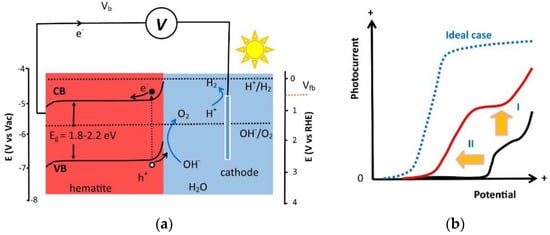 (a) Energy diagram for solar water splitting with a hematite photoanode performing the oxygen evolution reaction (OER) and a cathode carrying out the hydrogen evolution reaction (HER). The hematite bandgap (Eg), the flatband potential (Vfb), the applied bias (Vb), and the redox potential of water are indicated; (b) photoelectrochemical performance improvement of the hematite photoanode via surface modification. Arrow I indicates a photocurrent increase, arrow II indicates a photocurrent onset potential shift. The blue dotted line shows an idealized photocurrent vs. potential (I-V) of the hematite photoanode. The red line shows the I-V curve after surface modification while the back curve shows that of as prepared.
