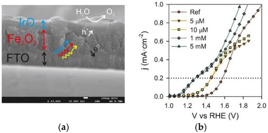 (a) Cross-section scanning electron microscope (SEM) image of fluorine doped tin oxide (FTO)/hematite and (b) steady-state I-V curves for bare hematite and after electrodeposition of pentamethylcyclopentadienyl (Cp*) iridium(III) [Cp*Ir(III)] from differently concentrated solutions (5 μM, 10 μM, 1 mM and 5 mM). The lines are used as eye guides. Reprinted with permission from Reference [], copyright (2013) American Chemical Society.