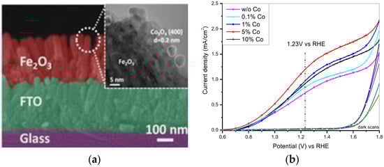 (a) Cross-section SEM image of hematite after annealing at 550 °C for 2 h and (b) I-V curves of hematite photoanodes with different amounts of Co2+ added to the precursor solution. Reprinted with permission from Reference [], copyright (2012) American Chemical Society.