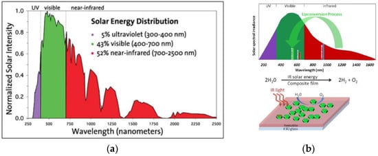 (a) Solar energy distribution and capture by a semiconductor photoabsorber; (b) mechanism of the up-conversion process (top) and enhanced solar water splitting performance by using near infrared radiation with the aid of rare earth materials (bottom). Reprinted from Reference [].
