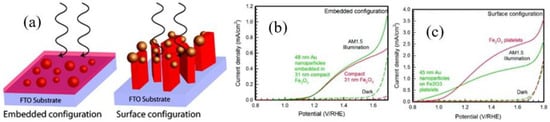 In recent years, surface plasmonic nanostructures have been widely studied in enhancing the solar water splitting efficiency [,,]. For example, the influence of gold nanoparticles on hematite photoanodes for solar water splitting was reported []. Only for electrode geometries with metal particles located at the semiconductor-electrolyte interface a relative enhancement was observed (see Figure 5) []. This is in agreement with the observation that minority carrier (holes) transport to the electrolyte is the most significant barrier to achieving high efficiencies in this system. In another study, three times higher light absorption and photocurrent improvement compared with the pristine hematite photoanodes are achieved from thin hematite films containing Au nanoparticles []. They found that the plasmonic enhancement goes along with an increase in the amount of Au nanoparticles for hematite films of constant thickness and is maximized for thin films. A thin hematite film can reduce the charge transport distance and have an optimal local field enhancement effect. The plasmonic resonance of metallic nanoparticles can also be adjusted through adjustment of the shapes or sizes to match the absorption bands of semiconductors []. It also strongly depends on the light incidence angle. The disadvantage of surface plasmonic metal decoration is the usage of noble metal, thus the high cost and low abundancy are critical issues.