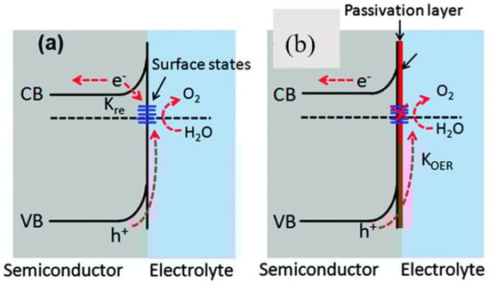 The band structures of an n-type semiconductor photoanode (a) without and (b) with a passivation layer. (a) High charge recombination happening at surface defects and thus inefficient water oxidation by the photo-generated holes; (b) use of thin non-catalytic passivation layers which suppress surface recombination and improve water oxidation. Adapted from Reference [], copyright (2016) Royal Society of Chemistry.