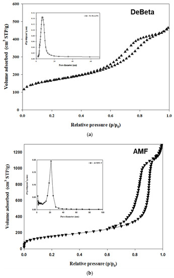Al-MSU-F(AMF) purchased from Sigma-Aldrich (St. Louis, MO, USA) has a cellular foam framework [25]. DeBeta was prepared by the desilication of Beta using NaOH solution [27,28]. For this, a commercial Beta (SiO2/Al2O3 = 38) was stirred in 0.2 M NaOH solution at 60 °C for 30 min, and ion exchanged as ammonium form in 0.1 M NH4NO3 solution. The prepared catalysts were calcined at 550 °C for 3 h before the analysis.