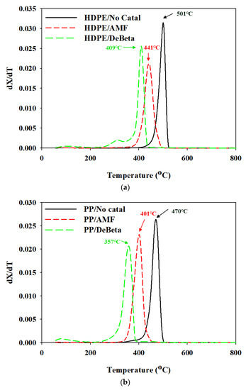 Figure 4 presents the derivative TG (DTG) results for the thermal and catalytic TGA of HDPE and PP over DeBeta and AMF.