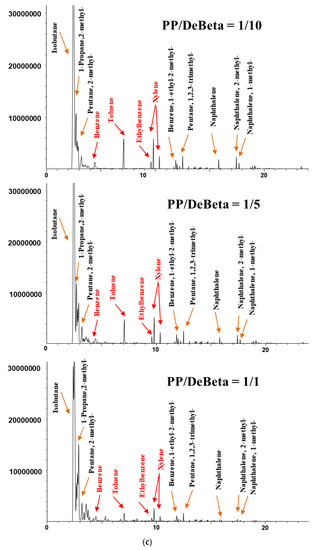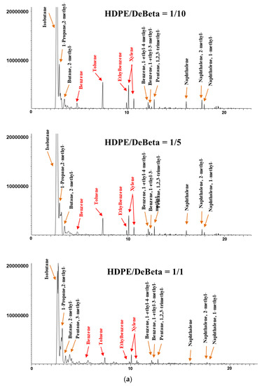Heavy aliphatic hydrocarbons were not detected on the chromatogram acquired from the CP of HDPE over DeBeta, even at small catalyst to plastic ratios (1/1), and light isoparaffins and aromatic hydrocarbons, such as benzene, toluene, ethylbenzene, and xylene (BTEXs), were the main products, owing to higher acidity. At a higher catalyst to plastic ratio, the peak intensities for aromatic hydrocarbons were increased further. The reason for the high cracking efficiency and monoaromatics formation over DeBeta can be attributed to the high acidity of DeBeta and the presence of micropores in this catalyst. The CP of HDPE and PP over DeBeta also revealed a higher reaction efficiency on cracking and aromatics formation compared to that over AMF because DeBeta had not only high acidity, but also mesopore structure. Therefore, DeBeta having micro/mesopores and high acidity can produce aromatic hydrocarbons more efficiently than AMF via scission, isomerization, cyclisation, hydrogen transfer, and oligomerization [12,25,26].
