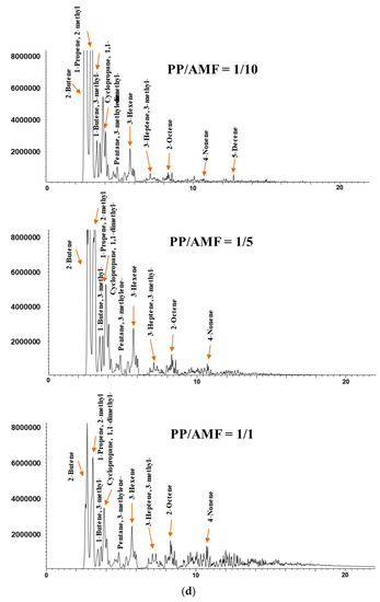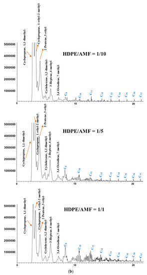 Figure 5 presents the chromatograms acquired from the catalytic Py-GC/MS analysis of HDPE and PP over different amounts of DeBeta and AMF. According to previous reports, the pyrograms of HDPE and PP are consistent with hydrocarbons having a wide carbon number distribution, more than C40. In addition, the chromatograms acquired from the catalytic Py-GC/MS analysis of HDPE and PP over AMF and DeBeta had a much narrower carbon range. This suggests that both catalysts have catalytic cracking efficiency. On the other hand, the CP products over AMF and DeBeta were different because DeBeta had higher acidity than AMF as shown in Figure 3. For example, a large amount of high molecular hydrocarbons were still observed on the chromatogram as a result of the CP of HDPE over AMF, even though these heavy hydrocarbons peaks decreased with increasing number of small molecular hydrocarbons by increasing the catalyst to plastic ratio from 1/1 to 10/1. This indicates that the overall efficiency for the formation of light hydrocarbons can be increased by increasing the amount of catalyst, even though AMF cannot provide a sufficiently high catalytic cracking efficiency. Generally, the thermal pyrolysis of plastics produces high molecular weight hydrocarbons, such as wax, by a radical mechanism via C–C bond breaking. CP degrades plastics via a carbenium ion mechanism. In addition, the CP of plastic produces branched hydrocarbons due mainly to the rearrangement of the carbocation in the carbenium ion mechanism. Therefore, the main reaction mechanism of the CP of plastics using AMF can be considered to be the carbenium ion mechanism [24].
