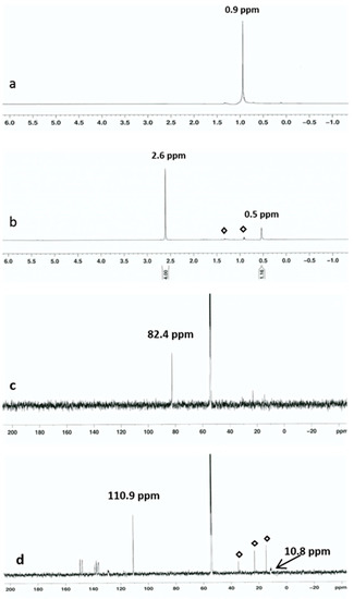 (a) 1H-NMR spectra of TaMe5; (b) 1H-NMR spectra of [TaMe4]+[MeB(C6F5)3]−; (c) 13C-NMR spectrum of TaMe5; (d) 13C-NMR spectrum of [TaMe4]+[MeB(C6F5)3]−, (at −40 °C, peak marked by (◊) is due to the slight amounts of pentane vapor which was used as a coolant during the low temperature reaction in the glovebox).