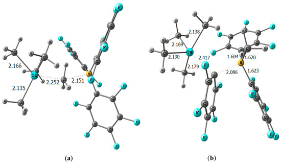 Transition states for (a) the demethylation of TaMe5 by B(C6F5)3 and (b) (C6F5)− transfer from B(Me)(C6F5)3− to TaMe4+, main distances are shown in Å.