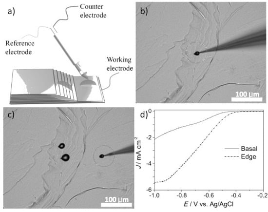 (a) Schematic illustration of the micro appliance for the oxygen reduction reaction (ORR) activity analysis. Optical image for showing the highly oriented pyrolytic graphite (HOPG) substrate serving as a working electrode by placing an air-saturated electrolyte droplet on (b) the edge and (c) the basal plane of HOPG. (d) LSV curves for ORR proceeded in an air-saturated electrolyte deposited either on the edge (see panel b) or on the basal plane (see panel c) of HOPG. (Reprinted with permission from Ref. [23], 2014 WILEY-VCH).