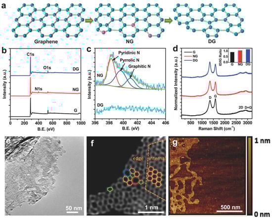 (a) Schematic illustration of the synthesis process of defect-rich graphene (DG). (b) X-ray photoelectron spectroscopy (XPS) spectra of the pristine graphene, NG, and DG. (c) The corresponding high-resolution N1s XPS spectra of NG as well as DG. (d) Raman spectra of pristine graphene, NG, and DG. (e) TEM image of DG sample. (f) HAADF image of DG sample determined at an accelerated voltage of 80 kV. Hexagons (orange), pentagons (green), heptagons (blue), and octagons (red) (g) The representative atomic force microscopy (AFM) image of DG sample. (Figures are reprinted with permission from Ref. [24], 2016 WILEY-VCH).