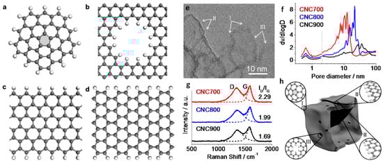Defect models of (a) Pentagon (highlight), (b) Hole, (c) Zigzag edge and (d) Armchair-like edge. C atom (gray), H atom (white). (e) Representative HR-TEM image of CNC700. (f) Pore size distributions for different samples. (g) The corresponding Raman spectra of CNC. (h) Schematic illustration of a carbon nanocage structure with three typical defective locations I (the corner), II (the broken fringe) and III (the hole). Reprinted with permission from Ref. [27], 2015 American Chemical Society.