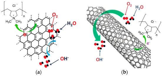 In addition to directly doping carbon skeletons with nitrogen, an alternative method was subsequently developed by Wang et al., where they found that the positively charged polyelectrolyte such as Poly-diallyl dimethylammonium chloride (PDDA) showed a vigorous electron-withdrawing capability and could create net positive and delocalized charges on the conjugated graphene surface when adsorbing onto the surface of graphene [30], leading to intermolecular charge transfer states. Consequently, the graphene catalyst adsorbing positively charged PDDA exhibits a much higher ORR electrocatalytic activity than wholly graphene (Figure 6a). Besides, Wang et al. also employed the positively charged PDDA to tune the ORR catalytic activity of pristine CNTs [31]. Electrons of electrons-rich carbon atoms on CNTs can be withdrawn by the functional groups (i.e., quaternary ammonium) on PDDA backbone, resembling the introduction of a p-type dopant, and therefore the positively charged carbon atoms can not only enhance the oxygen adsorption but also facilitate ORR through potent attraction of electrons from the anode (Figure 6b). These observations signify a vital function of intermolecular charge transfer in carbon and it seems that carbon atoms could also serve as the active sites for ORR.