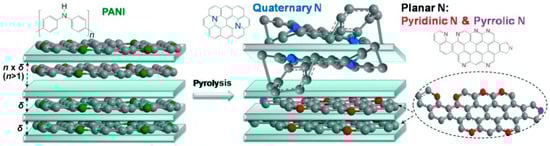 These results clearly demonstrated that the introduction of nitrogen doping or topological defects to carbon can reallocate the electron density within the carbon structure, thus leading to electron fluctuations on the carbon surface and improving oxygen adsorption. As mentioned above, the three main nitrogen doping configurations on carbon skeletons, including graphitic N, pyrrolic N and pyridinic N are regarded as potential active sites for catalyzing ORR, while the oxidized N is generally inactive. For pyridinic N and pyrrolic N, they are connected with two sp2 hybridized C atoms, while graphitic N (i.e., quaternary N) is directly bonded with three tetrahedral sp3 hybridized C atoms [32]. The planar sp2 hybridization of C–N bond shows a torsion angle of 0° while the tetrahedral sp3 hybridization is observed to show a torsion angle of 60° [33], hence pyrrolic N and pyridinic N usually show a planar platelet structure while quaternary N generally displays an uneven (three dimensional) structure. With a quasi-closed flat nanoreactor comprised of layered montmorillonite (MMT), Wei and co-workers synthesized pyrrolic N and pyridinic N-doped graphene (NG) which could selectively generate planar N via adjusting the interspace width of the MMT flat nanoreactor [34]. In their synthesis experiment (Figure 7), aniline (AN) monomers were first intercalated into the layers of MMT, and then in situ oxidation polymerization was performed, followed by high-temperature pyrolysis. High content (90.27%) of planar N (pyridinic N and pyrrolic N) is selectively generated and well-preserved by the MMT flat nanoreactor, leading to enhanced electrical conductivity as proven by the results of electrochemical impedance spectroscopy measurements as well as considerable ORR catalytic activity. The authors concluded that both pyridinic N and pyrrolic N are more active for ORR electrocatalysis than graphitic N which might benefit from the high electrical conductivity attributed to the reservation of planar structures after nitrogen doping. Although this conclusion still requires further support from the straight correlation between the ORR performance and a specific N, one can find that nitrogen doping configuration influences the local structure of carbon materials and hence finally on the corresponding ORR activity.
