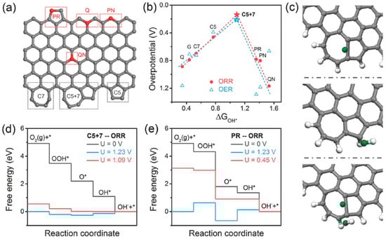 It is worth knowing that apart from the structure effects derived from nitrogen doping, topological defect is also proven to influence on ORR electrocatalytic activity. Recently, Zhang et al. synthesized edge-rich N-doped graphene mesh via direct carbonization of sticky rice with the presence of nitrogen source melamine and Mg(OH)2 nanosheet hard templates [35]. DFT calculations were performed to probe the possible ORR active sites derived from many structure factors, including nitrogen-doping, topological defects, and edge effects, for instance pyrrolic N, pyridinic N and quaternary N on the edge (Q), quaternary N in the bulk phase (QN), five-carbon ring (C5), seven-carbon ring (C7), as well as five-carbon ring wired to seven-carbon ring (C5+7) as depicted in Figure 8a. They found that for all nitrogen doping-caused sites, the sites neighboring to the edge exhibited a much lower overpotential in ORR catalysis, signifying the strong influence of edge effects on ORR. Topological defects (e.g., pentagon and heptagon carbon rings) can significantly diminish the overpotential of ORR in the DFT computation as compared with pristine graphene, and these nitrogen-free configurations that are contiguous to pentagonal and heptagonal carbon rings display the minimum overpotential as depicted in Figure 8b, locating the summit of volcano plots for both ORR and oxygen evolution reaction (OER). Based on their DFT results, the interacted O and OOH species preferably bind at the junction of the rings comprised of neighboring seven-carbon and five-carbon, whereas the O–O bond in OOH species are tend to be broken by the C5–C7 dipole in the C5+7 configuration and engender a facile reduction of oxygen (Figure 8c). It is believed that the discrepancy of electron densities induced by contiguous carbon rings is capable of developing spatial curvatures and further generating a permanent dipole moment. Therefore, a moderate adsorption might account for the higher ORR activity of the C5+7 configurations rather than that between nitrogen and carbon atoms because of the presence of stronger dipole moment. Also, the free energy diagrams of ORR sub-steps on active sites reveal the determining step is transformation of O* to OH* for pyrrolic N while desorption of OH− from C5+7 serves as the determining step (Figure 8d,e), further suggesting that the C5+7 defect promotes adsorption of oxygen intermediates. These results remind us of the importance of topological defects and provide a path to further understanding the active sites for ORR.