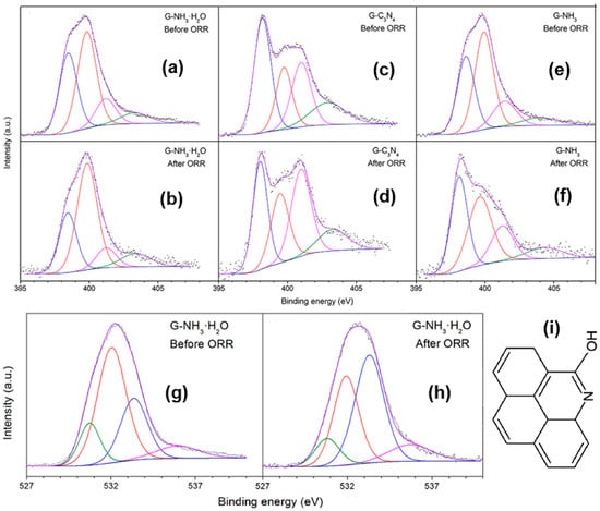 (a–f) The corresponding high-resolution XPS N1s spectra of the three multilayer graphene samples obtained before and after ORR. The least-squares fitted peaks are pyrrolic N at 399.8 eV (red), graphitic N at 401.2 eV (purple), pyridinic N at 398.5 eV (blue), and nitrogen oxide at 403 eV (green). XPS O1s spectra of G-NH3·H2O obtained (g) before and (h) after ORR. The fitted peaks are C=O at 530.8 eV (green), C(aliphatic)–OH/C(aliphatic)–O–C(aliphatic) at 532.0 eV (red), C(aromatic)–OH at 533.3 eV (blue), and chemisorbed water molecules at 535.7 eV (purple). (i) Diagram of the chemical structure of −OH attached to the pyridinic N. Reprinted with permission from Ref. [40] 2014 American Chemical Society.