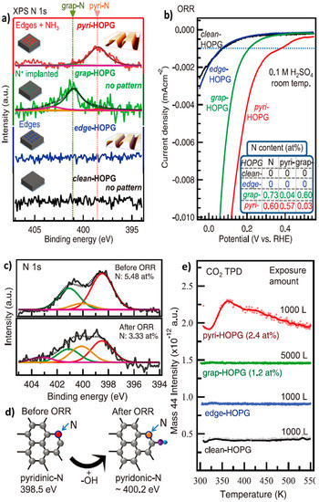 (a) The high-resolution N 1s XPS spectra determined for model catalysts. (b) The ORR catalytic results for model catalysts depicted in panel (a). Inset to the panel is nitrogen contents corresponding to the model catalysts. (c) N 1s XPS spectra of the N-HOPG model catalyst before and after ORR, respectively. (d) Schematic illustration of the formation of pyridonic N by the attachment of OH to the carbon atom adjacent to pyridinic N. (e) CO2-TPD results of the HOPG model catalysts. Reprinted with permission from Ref. [42], 2016, American Association for the Advancement of Science.