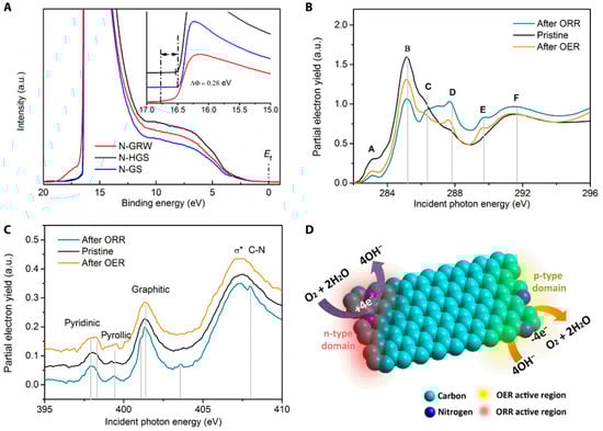 (A) UPS spectra collected using an He I (21.2 eV) radiation. Secondary electron tail threshold was enlarged and exhibited in the inset. (B,C) Carbon and nitrogen K-edge XANES spectra of N-GRW catalyst. In carbon K-edge XANES spectra, A: defects, B: π*C=C, C: π*C–OH, D: π*C–O–C, C–N, E: π*C=O, COOH, F: σ*C–C. (D) Schematic diagram of the N-GRW catalyst. n- and p-type domains carried different active sites for ORR and OER. Reprinted with permission from Ref. [45].