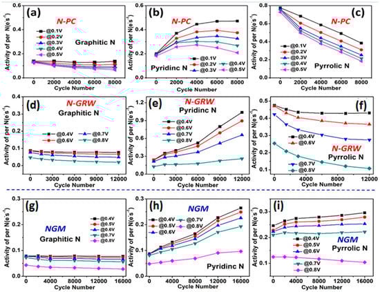 Plots for showing the evolution of specific activity against cycling number for (a,d,g) graphitic N, (b,e,h) pyridinic N and (c,f,i) pyrrolic N in (a–c) N-PC (d–f) N-GRW and (g–i) NGM.
