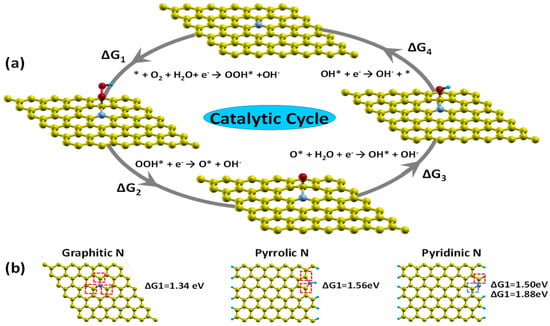 Furthermore, Gibbs free energy change of the first-electron reduction, regarded as a rate-determining step for the 4e− ORR process (Figure 13a), proceeded on carbons surrounding pyridinic or pyrrolic N was much higher than the one on carbon atoms contiguous to graphitic N (Figure 13b), according to the calculations of density functional theory (DFT). Based on these results, graphitic N might predominantly account for the ORR activity of N-doped carbon catalysts in alkaline electrolyte. Actually, several previous reports in the literature also reveal that graphitic N strongly influences on the ORR activity of N-doped carbons [46,47].