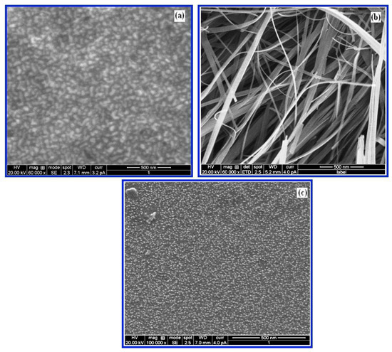 FE-SEM images of γ-Fe2O3 nanostructures synthesized using different % (1%, 2% and 3%) of AV extract (a) nanoparticle aggregates (b) nanobelts and (c) nanodots, respectively.
