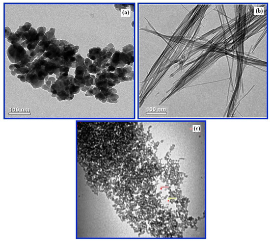 TEM images of γ-Fe2O3 nanostructures synthesized using different % (1%, 2% and 3%) of AV extract (a) nanoparticle aggregates (b) nanobelts and (c) nanodots, respectively.