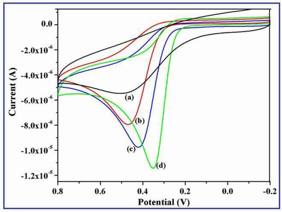 In the meantime, similar behavior was observed in Figure 12a, while increasing the concentration of UA from 1.2 µM to 0.031 mM in the presence of 0.05 mM DA.