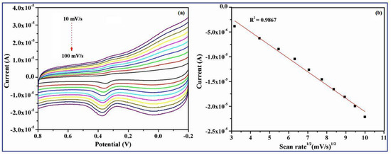 Figure 8a represents the CV curves of γ-Fe2O3 nanobelts modified GCE with the different sweep rates (10–100 mV/s) obtained at 0.3mM UA in 0.1 M PBS (pH 7.4).