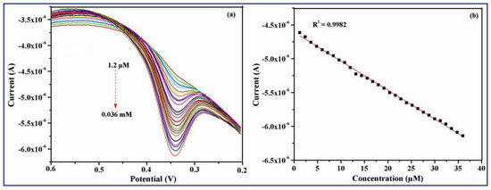 The DPV response of the γ-Fe2O3 nanobelts/GCE to the consecutive additions of UA was further estimated under optimized experimental conditions. Figure 9a shows that the aniodic peak current density of UA persistently increased with an increase in the concentration of UA from 1.2 µM to 0.036 mM at pH 7.4 (0.1 M PBS), suggested that the γ-Fe2O3 nanobelts/GCE is electro-active and presided for the electrochemical oxidation towards UA. The DPV response exhibited a high-quality linear concentration of UA in the range of 1.2 µM to 0.036 mM with a correlation coefficient of R2 = 0.9982, presented in the Figure 9b.