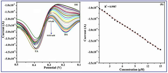 Furthermore, the DPV study has also been carried to evaluate the electrooxidation process of DA and UA simultaneously, by changing the concentration of one species and the other kept constant. Figure 11a illustrates the DPV current responses with increasing concentration of DA ranging from 0.6 µM to 0.015 mM at the γ-Fe2O3 nanobelts/GCE in the presence of 0.1 mM UA.
