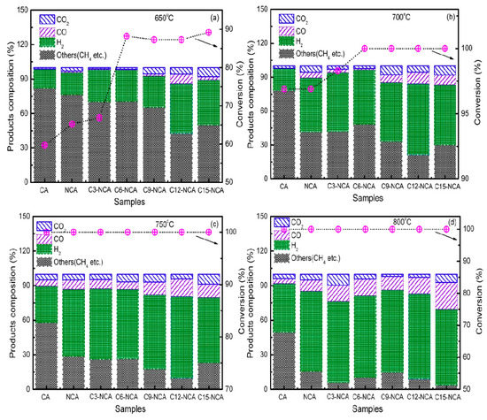 n-decane steam reforming is used as the probe reaction. The initial activity tests over the series catalysts were performed from 650 to 800 °C in order to examine the influence of temperature and different promoters on catalytic performance. n-decane conversion and H2 selectivity are considered the main parameters to check the advantages and disadvantages of the catalysts, and the results are shown in Figure 1a–d. The catalytic activities over these catalysts gradually increase with the temperature. Obviously, the presence of Ni or/and Co can effectively promote the rate of the steam reforming reaction, as well as the selectivity of H2 and n-decane conversion. Moreover, the synchronous introduction of Co and Ni further enhanced the catalytic activity compared with the 6%Ni/Ce-Al2O3(NCA) catalyst. This demonstrates that the addition of Co could provide sufficient Ni active sites for the reactants. In addition, the catalytic activity of x%Co-Ni/Ce-Al2O3 (CNCA) bi-metallic catalysts with different Co content increases firstly and then decreases with Co addition. The catalytic activity reaches the best when the Co content is 12%. This indicated that moderate Co is favor for promoting the activity. There is a synergistic effect between Co and Ni.