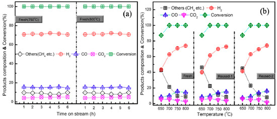 To better understand the effect of the ordered co-modification in n-decane steam reforming, the 12%Co-Ni/Ce-Al2O3 (C12-NCA) catalyst was screened out with a 6 h stability test at 750 °C and 800 °C, and the results are displayed in Figure 2a. It can be seen in Figure 2a that the H2 selectivity and n-decane conversion have a slightly change within 6 h. The C12-NCA catalyst has a good thermal stability. The C12-NCA catalyst also screened out for regeneration experiment. Carbon deposition on used C12-NCA catalyst was removed by oxygen enriched calcinations at 650 °C. The regenerative C12-NCA catalyst was carried out again in the same reactor as the fresh ones, and the contrast results are presented in Figure 2b. It is found that the n-decane conversions and H2 selectivity over the reused-1(-2) C12-NCA catalyst are approximately equal to the results of fresh one. Therefore, the C12-NCA catalyst is renewable.