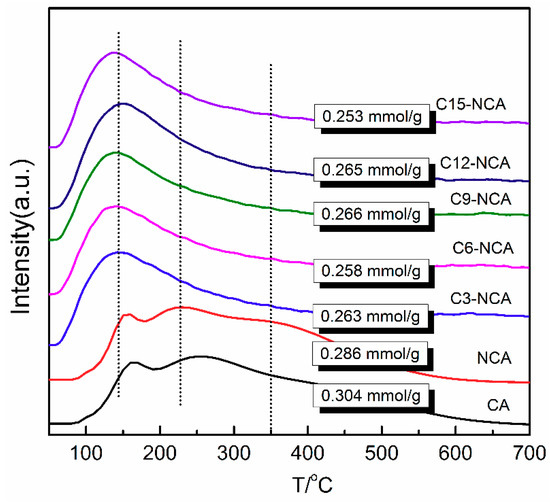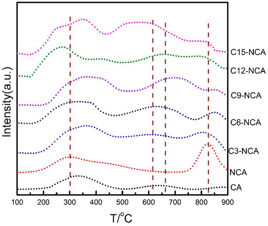 NH3-TPD technology was used to investigate the acidities of the series catalysts, such as total amount, nature, and strength distribution, in order to look for the possible interpretation for the above experimental results, and the profiles are shown in Figure 5. The area of desorption peak goes hand in hand with the total amount of surface acid sites, while the peak temperature is closely related to the strength of individual acid site. The peak temperature in the range of 80 to 200 °C is regarded as weak acid sites, and the desorption temperature between 200 to 400 °C is considered the medium acid sites, while the peak temperature locates at 400 to 700 °C corresponds to strong acid sites. Figure 5 shows that CA and NCA catalysts have three desorption peaks at the region of 100~500 °C, which is regarded as the desorption peak of the weak and medium acid. Moreover, all the Co doped NCA catalysts have one strong desorption peak at 100~400 °C. Obviously, the desorption peak temperature moves to a low temperature area by adding Co, suggesting that the amount of acid sites decrease with the introduction of Co. In our previous studies [12,18], we found that the larger acidity and active strong acid centers are easy to give rise to rapid deactivation of the catalyst due to carbon deposition. It is noteworthy that the addition of Co modifier increases the basicity of the NCA catalyst. This process will result in preventing alkenes further reacting into aromatic or heavier products, which is beneficial to reduce the carbon deposition over catalysts and prolong the work life of catalysts.
