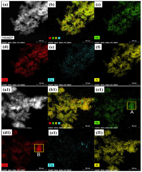 Energy dispersive spectrometer (EDS) mappings of the C12-NCA and C15-NCA catalysts. (a–f) belongs for C12-NCA catalyst; (a1–f1) belongs for C15-NCA catalyst.