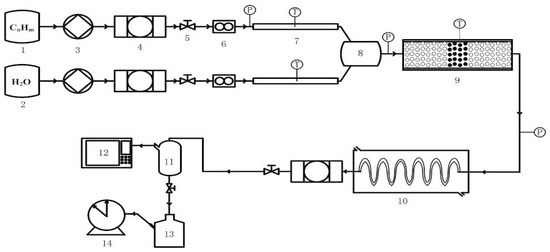 Schematic diagram of apparatus. 1-feed tank; 2-water tank; 3-high pressure metering pump; 4-filter; 5-check valve; 6-mass flow meter; 7-heating system; 8-mixer; 9-reactor; 10-cold trap; 11-gas-liquid separator; 12-gas chromatograph; 13-liquid receiver; 14-wet gas flow meter.