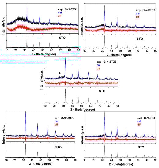 Figure 1 shows the XRD patterns for all the prepared photocatalysts assigned to SrTiO3 perovskite phase with a cubic symmetry (JCPDS No. 79-0176). The dominant peaks at about 32.4°, 39.9°, 46.4°, 57.8°, 67.8° and 77.2° represent the SrTiO3 (1 1 0), (1 1 1), (2 0 0), (2 1 1), (2 2 0) and (3 1 0) surfaces, respectively. The experimental measurements (black line) agree with the expected results (blue line) as denoted also from the difference measurement (red line) which is linear for all samples. The sharp peaks indicate that the obtained powders are highly crystalline and free from impurities. For the catalyst with the highest doping degree, G-N-STO3, additional diffraction peaks corresponded to SrCO3 phase (22.2%) were also detected and they are denoted with (▲) symbol at 2θ = 25.81°. For the XRD data of each sample, a Rietveld refinement was performed as reported in Reference [37]. The crystal size of the catalysts was calculated by appropriate software according to Williamson and Hall [38] type plot method and ranged from 14.2 nm for the G-N-STO3 to 35.7 nm for the G-N-STO1 (glycine dopant source; N:Sr:Ti 1:1:1 molar ratio) as shown in Table 1. The crystal size values of the N-doped with glycine photocatalysts are decreased while doping is increased as also observed by the broader crystalline peaks for G-N-STO2 (glycine dopant source; N:Sr:Ti 2:1:1 molar ratio) and G-N-STO3 samples. The refinement parameters of % crystal phase, cell parameters (a, b and c) as well as strain analysis together with R2 are also presented in Table 1. Compared to the STO sample, the (110) diffraction peaks of the XRD pattern for the different N-doped catalysts shifted towards higher angles as a result of nitrogen incorporation into the O2− sites in SrTiO3 lattice. The lattice constants (a, b, c) for the N- and N,S-doped photocatalysts are slightly higher from those of STO. This can be attributed to the expansion of lattice because of the insertion of dopant atoms. From the calculated strain analysis it is observed that G-N-STO3 has a negative strain value at −0.029. This value probably shows that higher degree of N-doping inhibits crystal growth and deforms crystal lattice.
