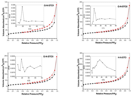 Adsorption—desorption isotherms and pore size distribution for all photocatalysts (G-N-STO1, G-N-STO2, G-N-STO3, H-N-STO, C-NS-STO and STO).