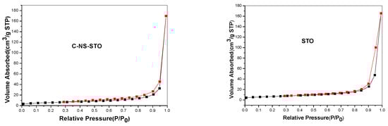 The nitrogen adsorption—desorption isotherms for the studied catalysts are presented in Figure 2. C-NS-STO (L-cysteine dopant source: N:S:Sr:Ti 1:1:1:1) and STO photocatalysts represented non-porous materials and the isotherms belong to type–II according to IUPAC classification [39]. For G-N-STO1, G-N-STO2, G-N-STO3 and H-N-STO (L-histidine dopant source; N:Sr:Ti 1:1:1) catalysts IV(a)—type isotherms with an H2(b) hysteresis loop were observed indicating mesoporous materials according to IUPAC classification [39]. The interconnectivity of pores that are formed among inter—aggregated particles is the explanation of the H2(b) hysteresis loop formation. For G-N-STO1, G-N-STO2, G-N-STO3 photocatalysts the existence of hysteresis loop (Figure 2) is characteristic of the presence of mesopores while the peak at about 36 Ǻ in the PSD curves is due to the presence of finer pores (micropores). The specific surface area (SSA) of all prepared photocatalysts are presented in Table 2 and ranged between 20.7 m2/g for C-NS-STO to 89 m2/g for the H-N-STO. It is well known that in the solution-combustion synthesis parameters such as type of fuel (different amino-acid in this case), fuel/oxidizer ratio, ignition temperature, produced flame influences the characteristics (surface area, crystallite size, agglomeration) of the produced materials [40]. For example, the rapid generation of large volume of gases during combustion reduces the possibility of sintering and creates pores between particles. On the other hand, combustion temperature can reach >1000 °C according to the produced flame enhancing the sintering [41]. It seems that the reaction in the presence of glycine is more rapid (auto-ignition 180–200 °C) in comparison with the reactions in the presence of L-cysteine (auto-ignition around 290 °C). Also, for LaFeO3 perovskite synthesized by glycine process it has been reported [41] that specific surface area (SSA) values increase with the increase of glycine to nitrate ratio until a certain value while the crystal size decreases, a trend that is similar to that observed in the present study.