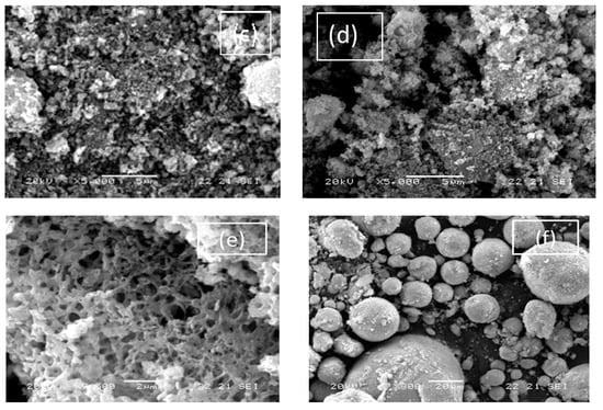 SEM images of all photocatalysts used in the study: (a) G-N-STO1; (b) G-N-STO2; (c) G-N-STO3; (d) H-N-STO; (e) C-NS-STO; (f) STO.