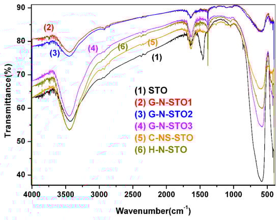 The FT–IR spectra of the N, N/S—doped photocatalysts and STO are presented in Figure 4. In all samples the shoulder below 1000 cm−1 appears because of the SrTiO3 crystal lattice vibrations [42]. Specifically, the bands around 858 and 596 cm−1 are caused from the stretching vibration of Sr-O and Ti-O bond, respectively [43]. Also for all samples the absorption peak around 3443–3447 cm−1 can be caused from the stretching vibrations of lattice hydroxyls from Ti-OH perturbed by nearby Sr atoms or by Sr-OH [42]. The band around 1637 cm−1 for STO is due to the bending vibration of -OH (caused from bending water) [42,44]. The absorption peak around 3443 cm−1 can be caused from the stretching vibrations of lattice hydroxyls from Ti-OH perturbed by nearby Sr atoms or by Sr-OH [42]. G-N-STO1, G-N-STO2 and G-N-STO3 photocatalysts have presented a characteristic peak at 1384–1386 cm−1 which is attributed to the stretching vibrations of interstitial N-O [45]. The intensity of this peak is proportional to the doping ration of the G-N-STO catalysts. Additionally, all three of them have a peak between 1630–1644 cm−1 which can be attributed to surface N-H bonds [33,46]. Also, the peak that appears at 3447 cm−1 corresponded to the stretching vibrations of lattice hydroxyls from Ti-OH or by Sr-OH [42,47,48]. The peaks in 2851, 2927 cm−1 for G-N-STO1 and in 2856, 2927 cm−1 for G-N-STO2 are due to CH2 asymmetric stretching vibrations from residual organics in the material. The peak in 1261 cm−1 in both G-N-STO1 and G-N-STO2 is caused by C = O vibrations. In the C-NS-STO photocatalyst the small peaks at 1047 and 1263 cm−1 are due to the frequencies of bit—dentate S-O coordinated to Ti+4 [47,48]. Also the peak in 1381 cm−1 is attributed to the stretching vibrations of interstitial N-O [45]. The peaks in 1636 and 3440 cm−1 are caused from the bending vibration of –OH [48,49] and the stretching vibrations of lattice hydroxyls from Ti-OH or by Sr-OH [42,48,49] respectively. In the H-N-STO the peaks in 1637 and 1386 cm−1 correspond to the stretching vibrations of N-O [45] and to bending vibration of -OH [48,49], respectively. The peak in 3440 cm−1 is attributed to the stretching vibrations by Ti-OH or by Sr-OH [42,48,49].