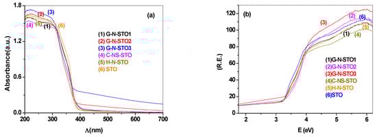 The diffuse reflectance spectroscopy (DRS) results of all photocatalysts are presented in Figure 5a. The optical absorption edge of pure SrTiO3 (STO) was about 390–395 nm as expected, so no response against visible irradiation was observed. On the other hand G-N-STO2 and G-N-STO3 were significantly red shifted to longer wavelengths into the visible light region (till 415 nm) while the absorption edges of G-N-STO1, H-N-STO and C-NS-STO presented a smaller shift (about 7 nm) in comparison to STO. The Eg values (Table 2) of all photocatalysts were calculated with the use of Kubelka—Munk plots which are presented in Figure 5b. The Eg values of the N-,N,S-doped photocatalysts had the following trend: H-N-STO > C-NS-STO,G-N-STO1 > G-N-STO2 > G-N-STO3. From this trend it can be concluded that the absorption edge of the samples prepared with glycine and among them the sample with the highest N–doping presented the greater shift to the visible light region.