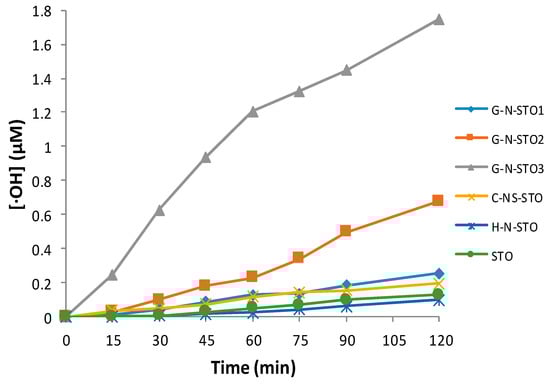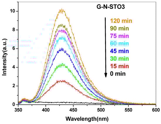 The evolution of fluorescence spectra intensity of hydroxy-terephthalic acid (TAOH) for the G-N-STO3 photocatalyst at different intervals within an irradiation time framework of 120 min is displayed in Figure 6 as a characteristic example. The fluorescence spectra for the rest of photocatalysts prepared are shown in Figure S1 (Supplementary Materials). As it is shown, the fluorescence intensity increases along with time. The kinetics of •OH radicals’ formation for all photocatalysts is shown in Figure 7. The observed linear relationship between the fluorescence intensity (i.e., •OH radicals formation) and the time denoted the stability of the synthesized catalyst. The ability of the photocatalysts to generate •OH radicals followed the trend: G-N-STO3 > G-N-STO2 > G-N-STO1 > C-NS-STO > H-N-STO, STO. As a result, catalyst showed greater •OH formation compared to the catalyst prepared by cysteine and histidine while G-N-STO3, that is, the catalyst with the higher dopant content generates the largest amount of •OH. This observation can be further explained by the the formation of the SrCO3/SrTiO3 junction structure which helps reducing electron/hole pairs recombination as reported elsewhere [50].