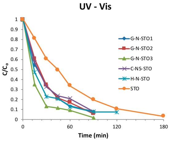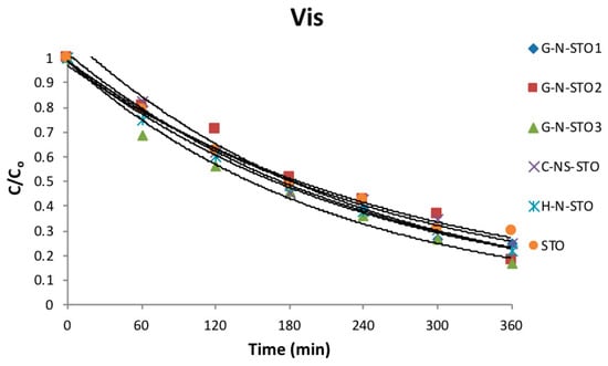 The photocatalytic activity of all catalysts towards the degradation of MB under UV-Vis and visible irradiation is depicted in Figure 8 and Figure 9 respectively. The degradation for all samples followed first order kinetics. As expected, the degradation kinetics under visible light irradiation was slower than under UV–Vis (simulated solar) irradiation. The apparent rate constants (k), the corresponding correlation coefficients (R2) and half-lives (t1/2) of all photocatalysts are presented in Table 3. Based on the determined apparent rate constants the photocatalytic activity followed the same trend under both UV-vis and visible irradiation: G-N-STO3 > G-N-STO2 > G-N-STO1 > H-N-STO > C-NS-STO > STO. All N- and N/S-doped photocatalysts presented higher photocatalytic activity than SrTiO3 while among all doped photocatalysts G-N-STO3 showed the higher photocatalytic activity. The above observations come in full agreement with the results from the characterization of the materials as previously discussed. More specifically the catalytic activity follows the same trend with the •OH production ability while G-N-STO3 was the material with the lower Eg value, that is, the higher absorption in visible region, the smallest crystallite size, that is, the lower electron—hole recombination due to more effective charge diffusion into the surface and the lowest PZC entailing the higher MB adsorption due to the attraction of negatively charged surface to the cationic dye. For the catalysts G-N-STO3, G-N-STO2 and G-N-STO1 sharing the same nitrogen source (glycine) it can be concluded that the increase of N-doping improves the photocatalytic activity. The activity follows closely the same trend as for Eg, crystal size, specific surface area, PZC and •OH production ability. In conclusion, the overall activity of the prepared catalysts is a matter of interplay of the above mentioned properties with particle size, Eg and •OH formation being the most important ones.