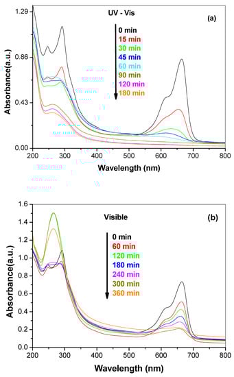 In Figure 10a,b the profiles of the temporal change in absorbance of MB for G-N-STO3 catalyst are presented for both UV-Vis and visible light irradiation. Based on the spectral profiles the degradation route of MB in both UV-Vis and visible light can be proposed. The characteristic absorption peaks of MB around 246, 291 and 664 nm correspond to benzene and heteropolyaromatic rings, respectively. It can be observed that the characteristic peaks decreased with time while 665 nm peak shifted towards the blue region (hypsochromic effect). Figures S2 and S3 (Supplementary Materials) presented the blue shift in MB spectra along the photocatalytic treatment in the presence of the prepared photocatalysts under UV-Vis and visible light irradiation. The blue shift in λmax suggested the stepwise removal of auxochromes (methyl or methylamine) [49,51]. As a result the degradation pathway of MB can be suggested to follow consecutive N-demethylation as reported also elsewhere in the literature [52]. The electron donor properties of methyl groups facilitate the attack of •OH radicals for the demethylation pathway, which is considered to be an important step in the degradation of MB [49,51]. The intermediates can be identified based on the different absorption spectra characteristics as follows: azure B (λmax: 648–655 nm), azure A (λmax: 620–634 nm), azure C (λmax: 608–612 nm) and thionine or phenothiazine (λmax: 602 nm) [49]. Under UV-Vis light irradiation all the above mentioned intermediates are formed and after 180 min of irradiation only a small band between 246 and 291 nm was still present showing the presence of low concentrations of benzene derivatives and almost complete degradation. On the other hand, under visible light after 360 min of irradiation only azure B is formed while the bands at 246, 291 nm were only slightly decreased suggesting the much lower degree of degradation.