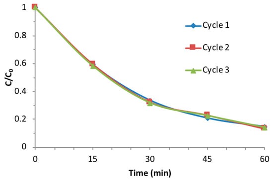 Finally, the stability of the best catalyst (G-N-STO3) for three consecutive photocatalytic cycles was also investigated. As shown in Figure 11, the catalyst presented a stable photocatalytic activity among the repeated catalytic cycles and about 95% of the initial degradation efficiency was maintained suggesting the G-N-STO3 catalyst has a good reusability. The slight decrease in the photocatalytic efficiencies could be ascribed either to a minor extent of accumulation of later stage products into the catalyst surface after the first catalytic cycle or to small losses of catalyst during the recovery procedure due to the good dispersibility into the aqueous solution.